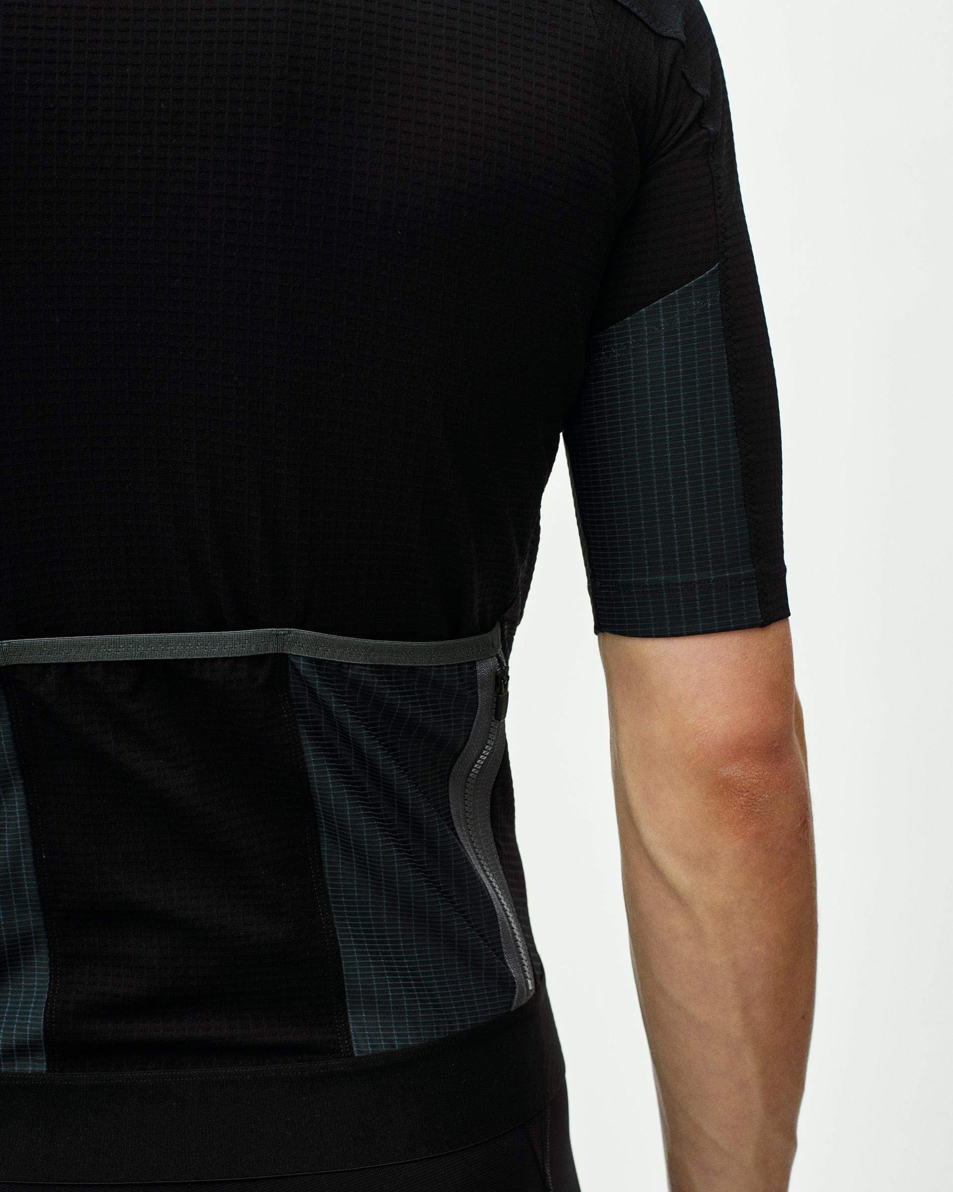 The jersey features two extra trash pockets on the back of the arms and above the rear pockets.